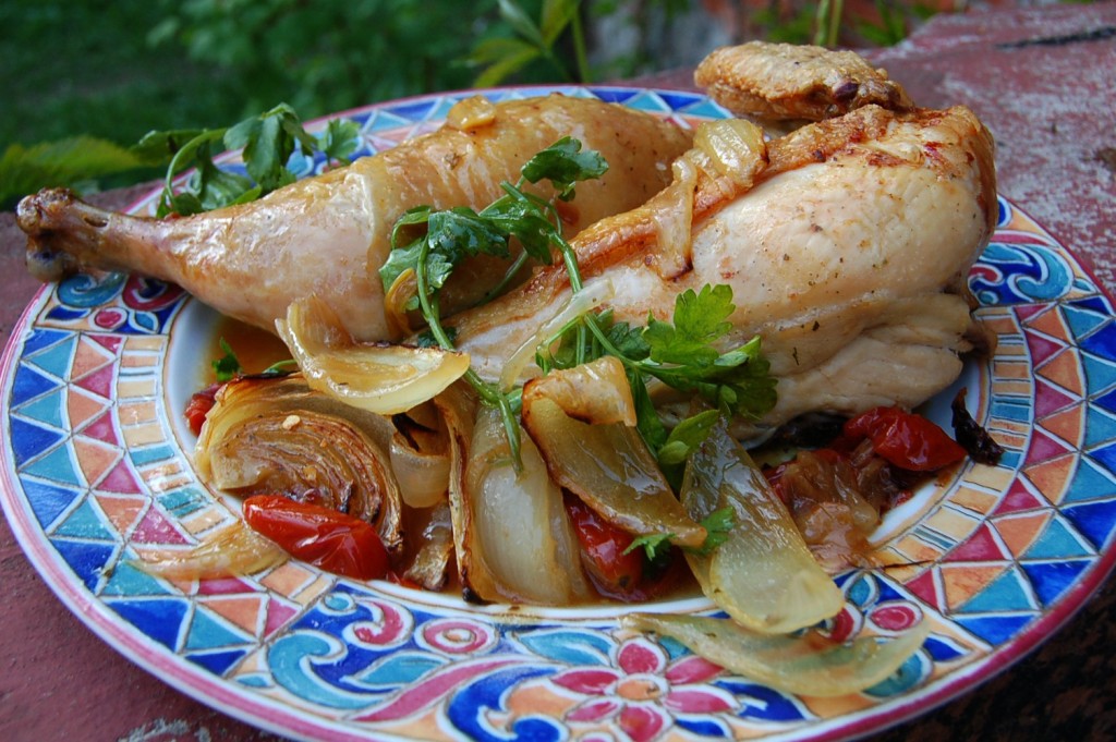 Выкладываем курочку с помидорами и луком на тарелку и приступаем к трапезе.