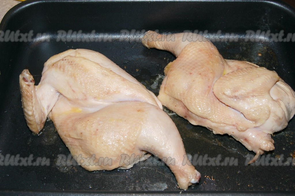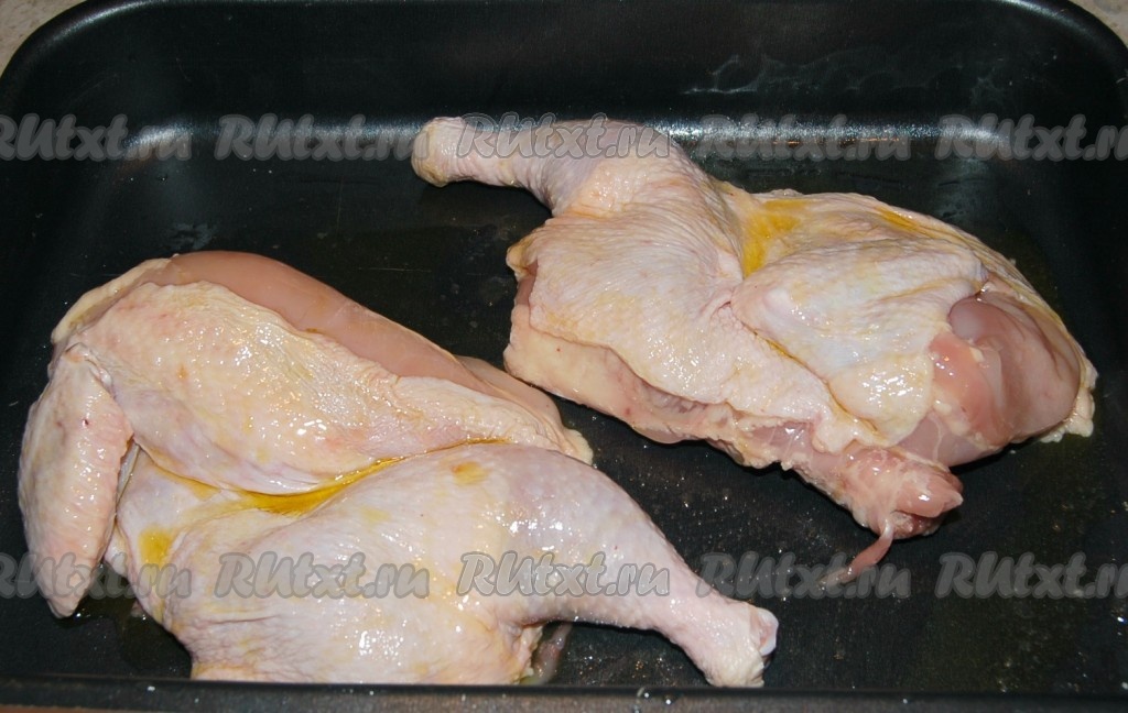 Разрезать ее на две половинки, посолить, поперчить, уложить их на противень, смазанный растительным маслом. Хорошо смазать курицу растительным маслом.