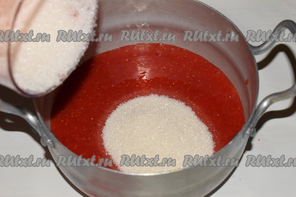 Выливаем пюре в кастрюльку, в которой планируем варить джем. К клубничному пюре добавляем сахар и хорошо перемешиваем.