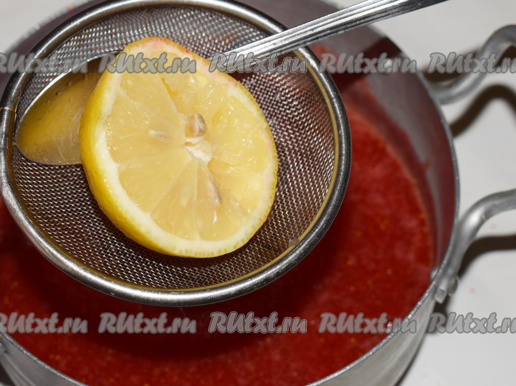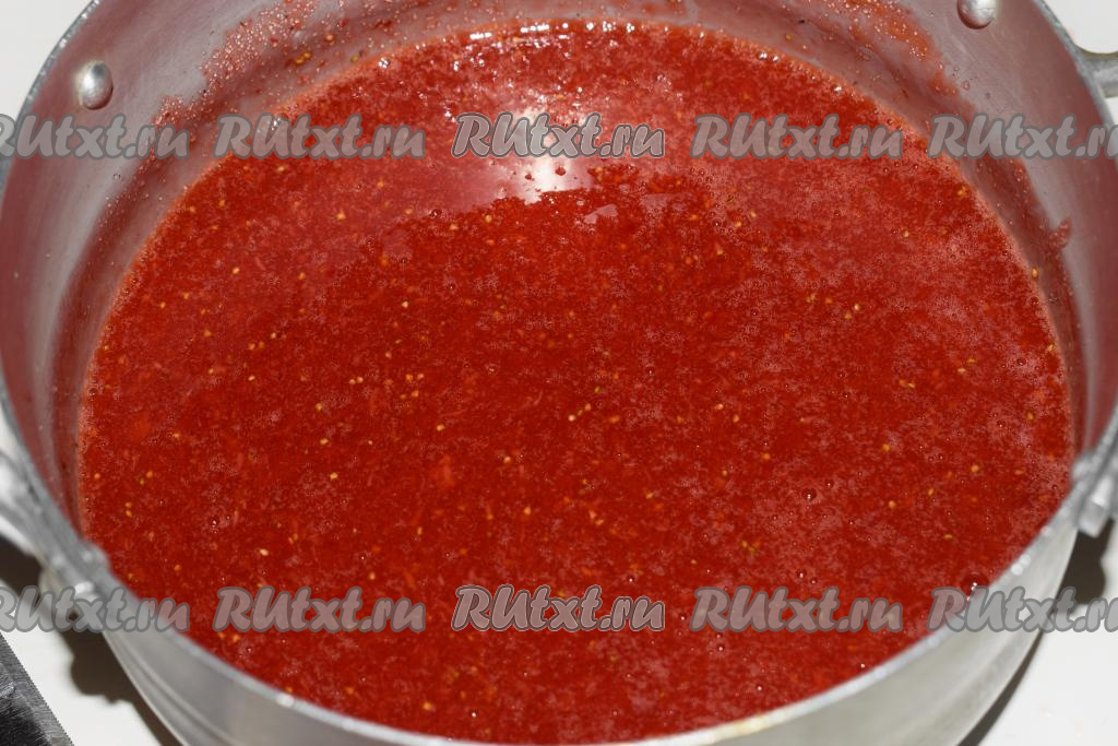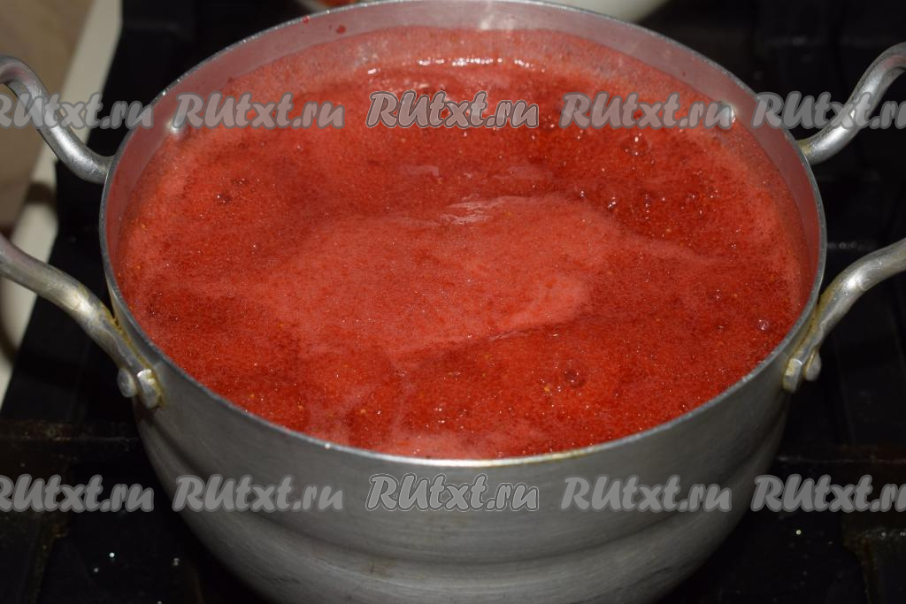 Ставим кастрюльку с клубничным пюре на плиту и варим наш джем до закипания на среднем огне. Если в процессе закипания появляется пена, то снимаем ее при помощи ложки (у меня пенки оказалось совсем немного, буквально, 2 ложки).