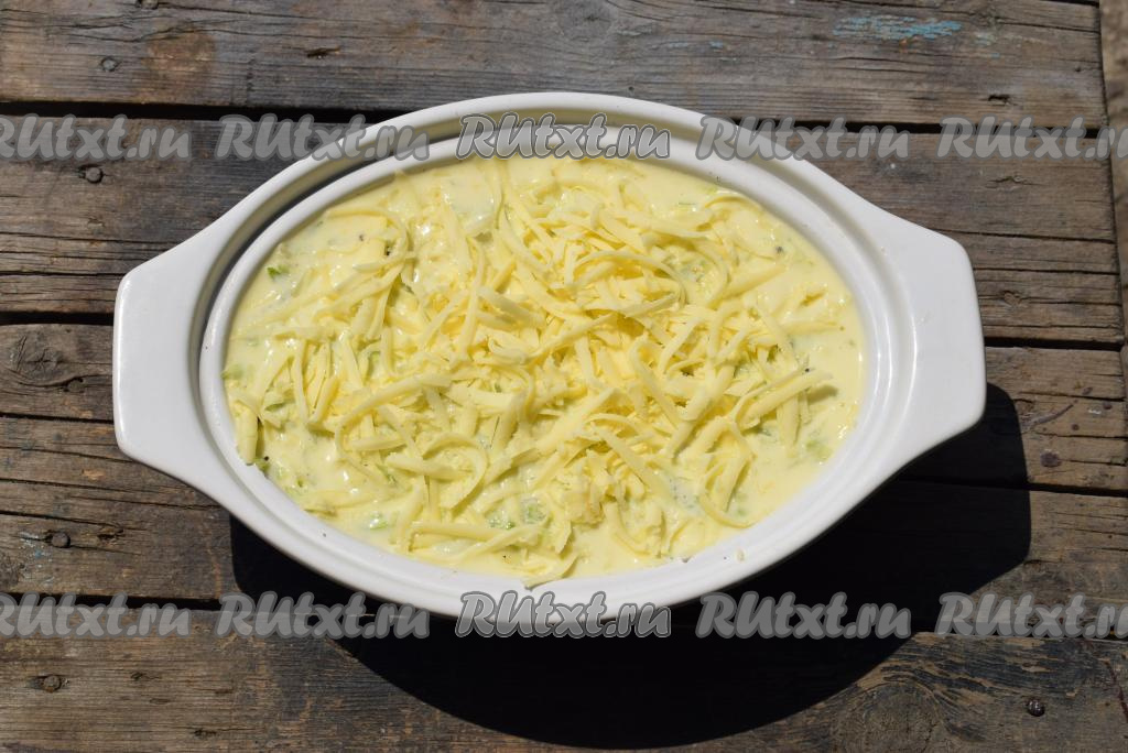 В керамическую форму (или другую форму для выпечки), не смазывая дно маслом, первым слоем равномерно выкладываем половину капусты, смешанной с кабачком.
