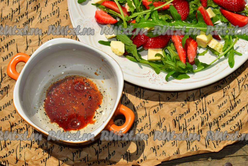 Выкладываем клубнику, рукколу и сыр на тарелку, в которой будем подавать салат, поливаем приготовленной заправкой и слегка перемешиваем.