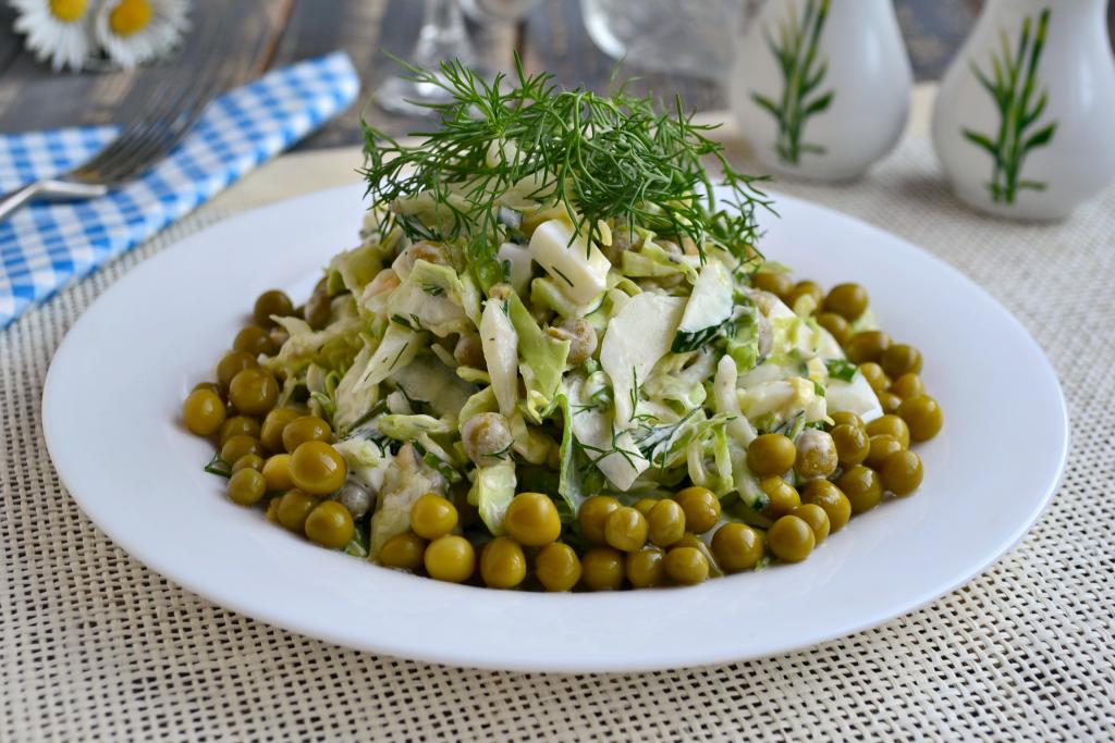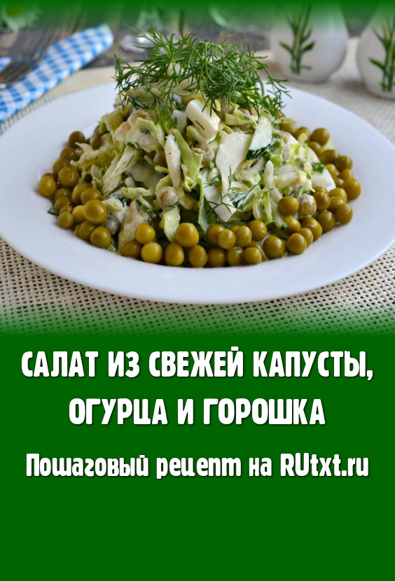 Вкусный, сочный салат из свежей капусты, огурца и горошка сразу же подать к столу. Обратите внимание, что готовить такой салатик лучше непосредственно перед подачей.