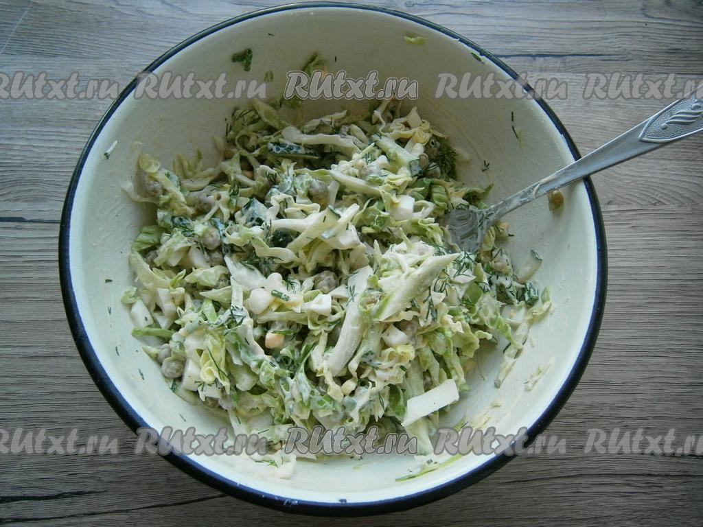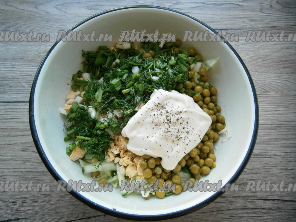 Мелко нарезанные зеленый лук и укроп, соль, молотый чёрный перец и майонез добавить в салат из капусты, яиц, горошка и огурца.