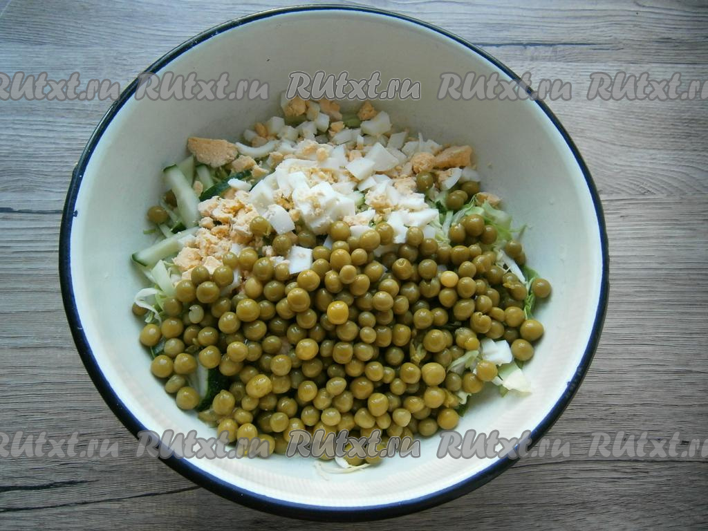 Сюда же добавить рубленные вареные яйца и консервированный горошек.