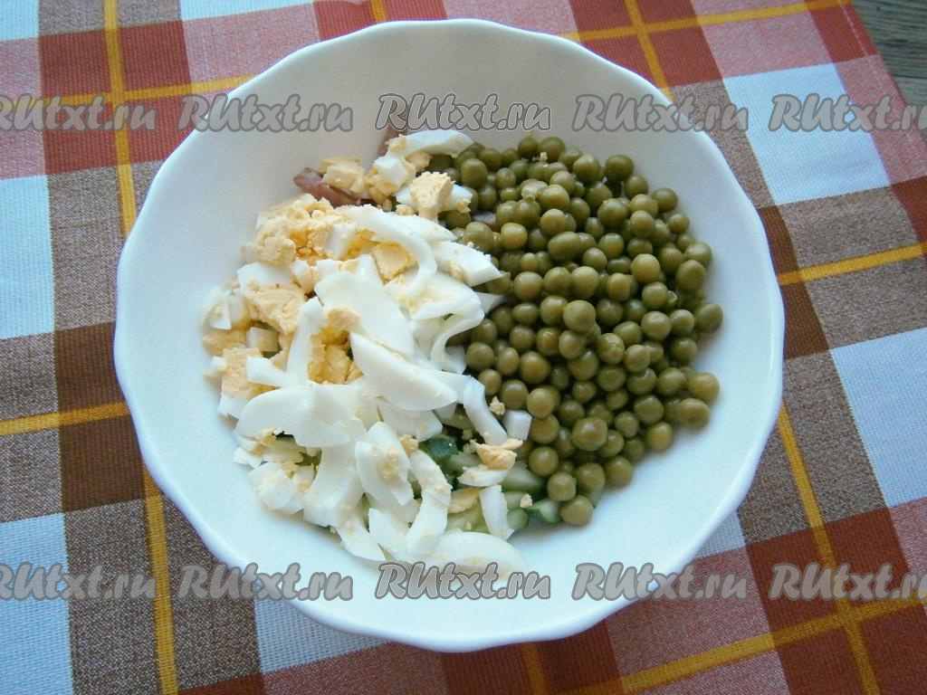 Вареные яйца, очищенные от скорлупы, нарезать продолговатыми кусочками и вместе с консервированным горошком выложить в салат из огурца и полукопченой колбасы.
