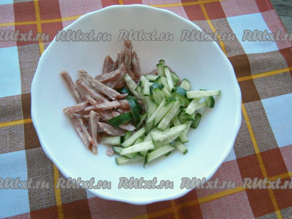 Полукопченую колбасу и свежий огурец нарезать соломкой или брусочками.