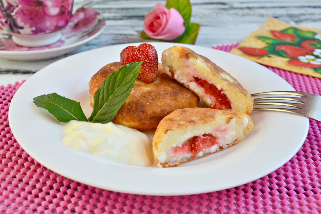 Очень вкусные, воздушные сырники, приготовленные с клубникой, можно подать со сметаной и в горячем, и в остывшем виде.