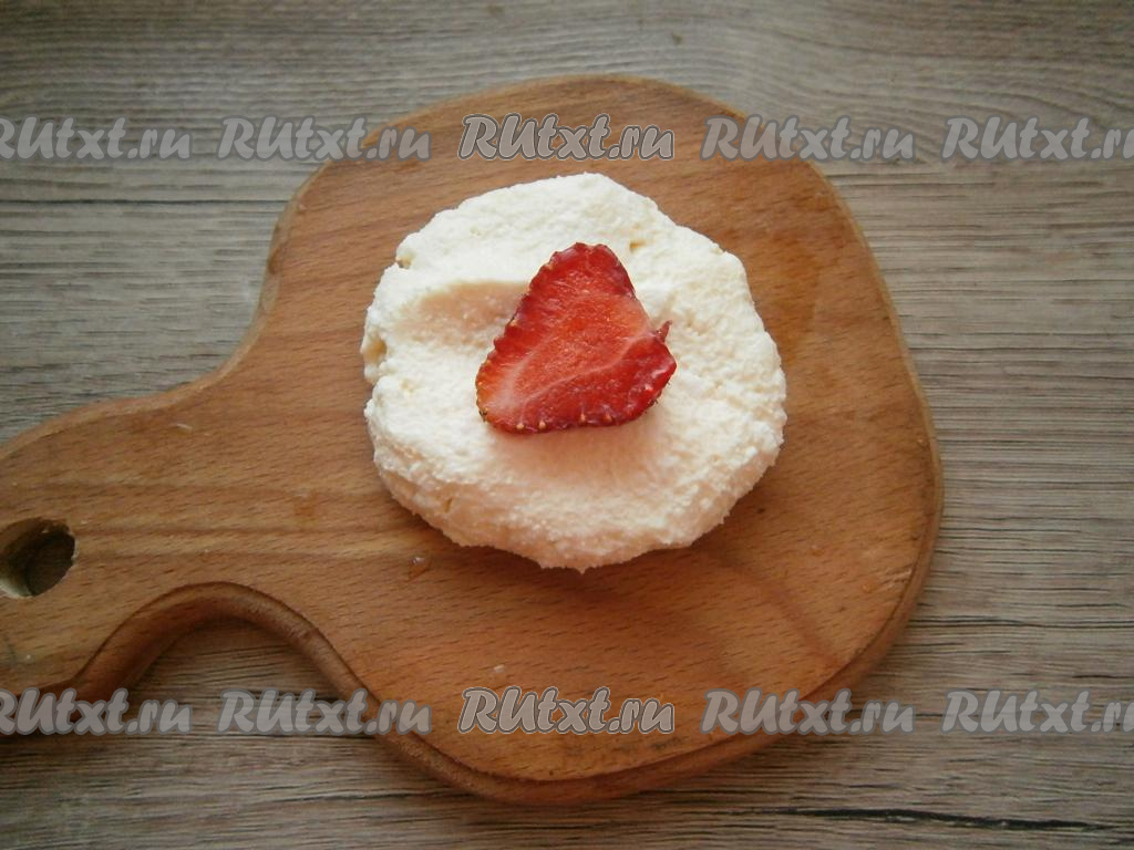 Мокрыми руками сформировать из небольшого количества творожного теста лепешку, в середину которой поместить половинку ягоды клубники.