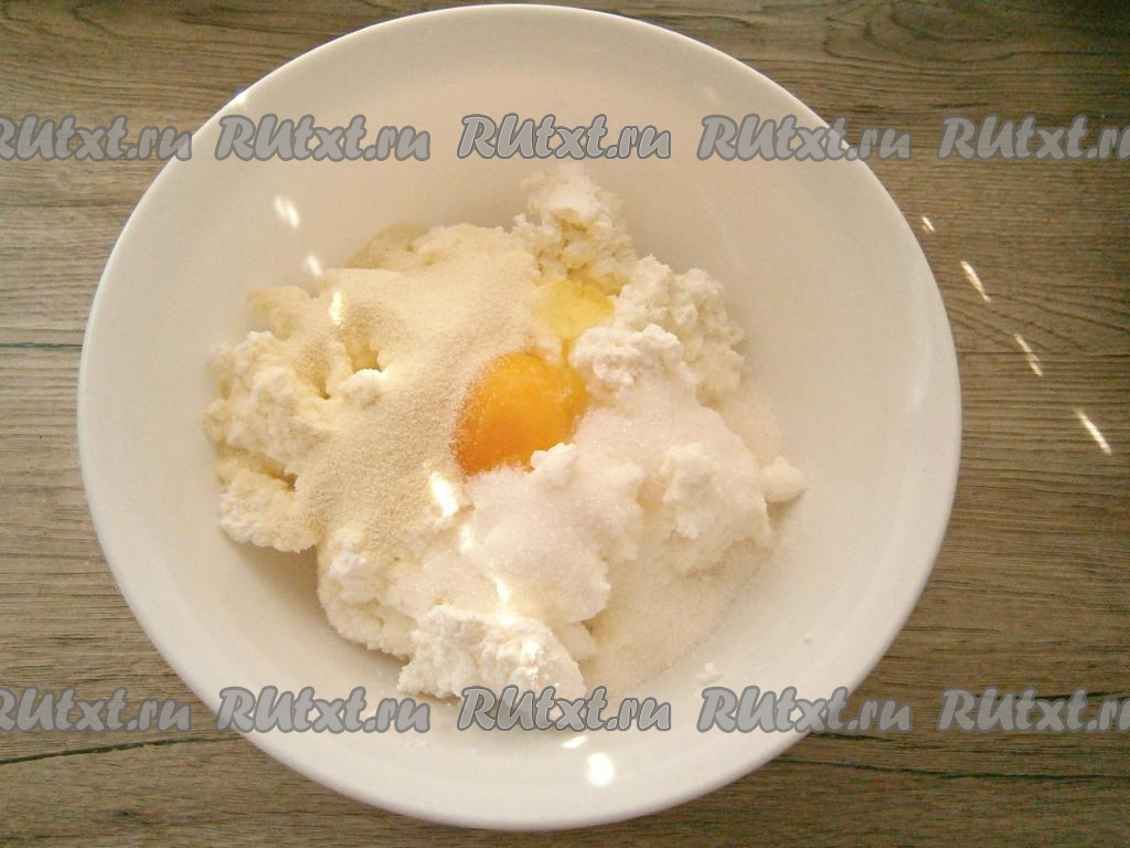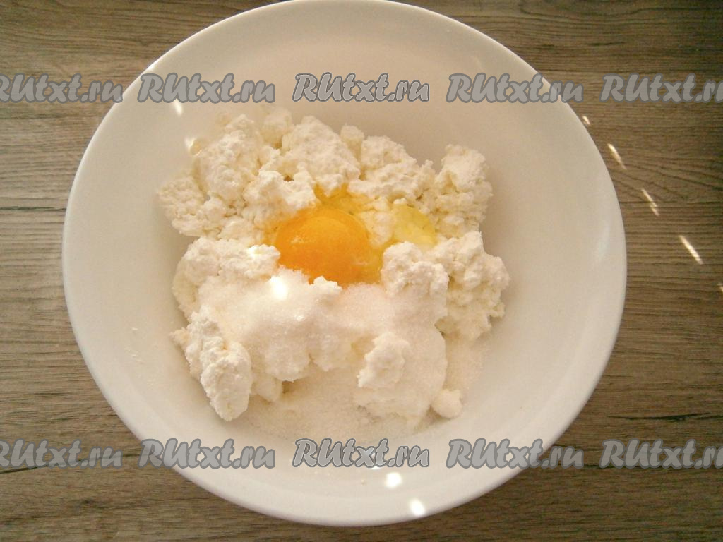 В творог добавить сахар, щепотку соли и сырое яйцо.