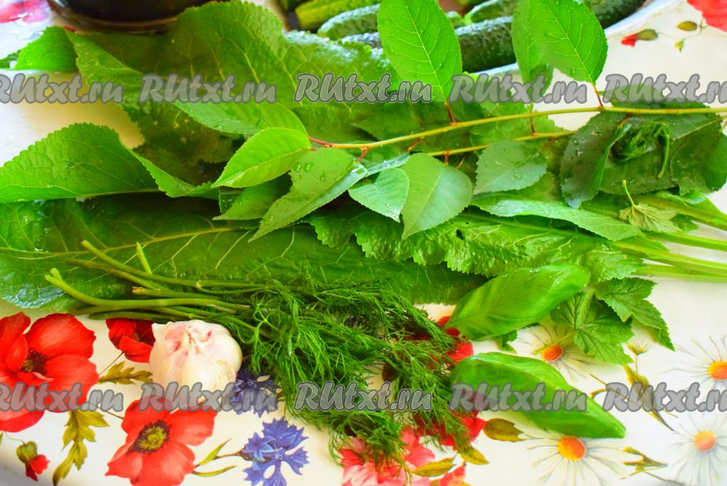 На дно емкости, в которой планируете малосолить огурцы, кладем 1,5 листа хрена, 3 листочка смородины, 5 листиков вишни, половину укропа и 5 зубчиков чеснока, далее выкладываем 5 горошин чёрного перца, 2 горошины душистого перца, 1 бутон гвоздики, 2 лавровых листа.