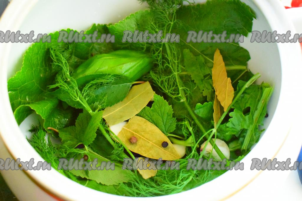 Поверх огурцов раскладываем оставшиеся листья, укроп, чеснок и специи.