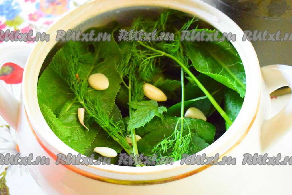 Укроп, листья хрена, черной смородины и вишни моем, даем стечь воде. Очищаем зубчики чеснока.