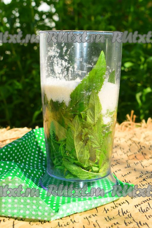 Поверх листиков мяты насыпаем 50 грамм сахара и начинаем взбивать до однородности. Когда мята пустит сок, добавляем еще 50 грамм сахара.