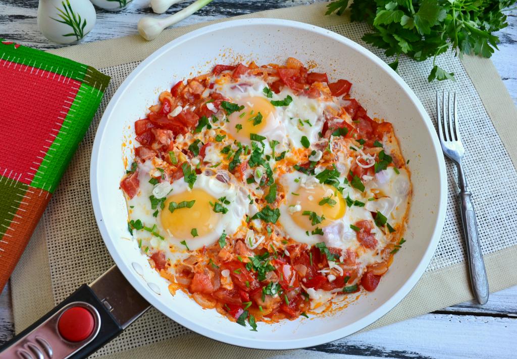 Простую в приготовлении и очень вкусную еврейскую яичницу "Шакшука" подать к столу в теплом виде.