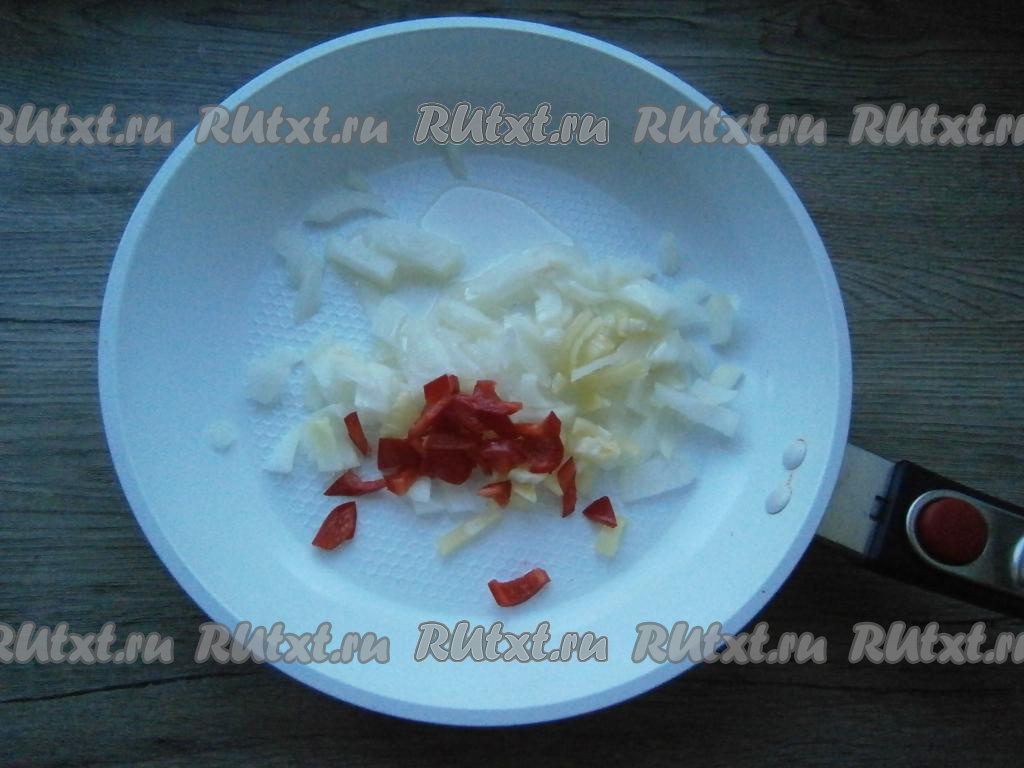 Репчатый лук очистить и нарезать кусочками. Болгарский перец, очистив от семян, нарезать соломкой и вместе с луком выложить на сковороду, влить растительное масло.