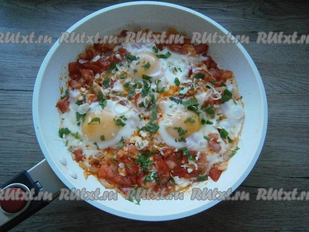 Накрыть сковороду крышкой и на слабом огне прожарить яйца около 2-3 минут, но так, чтобы желтки остались жидковатыми. Готовую яичницу "Шакшука" посыпать измельченным чесноком и зеленью петрушки.