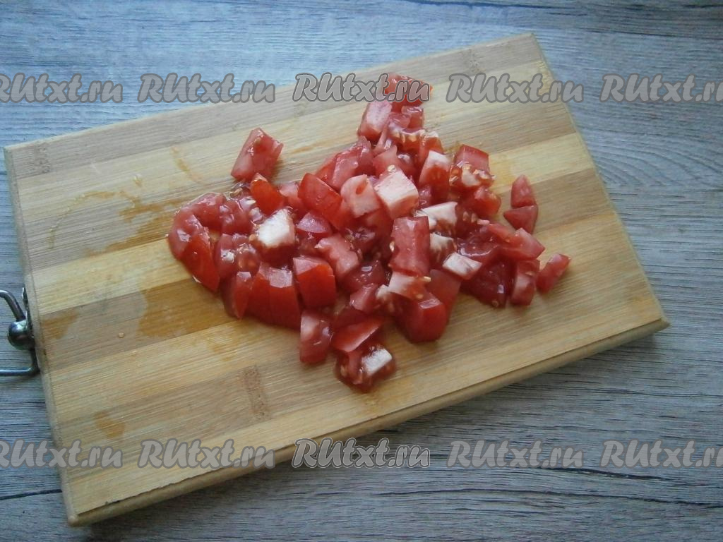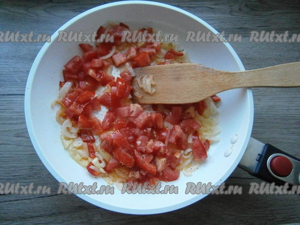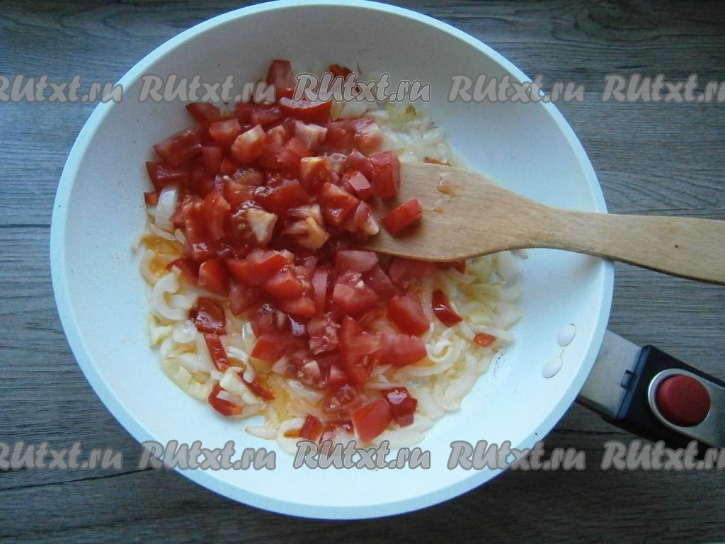 Лук с перцем обжарить на среднем огне, помешивая, минуты 2-3, после чего добавить помидоры, перемешать.