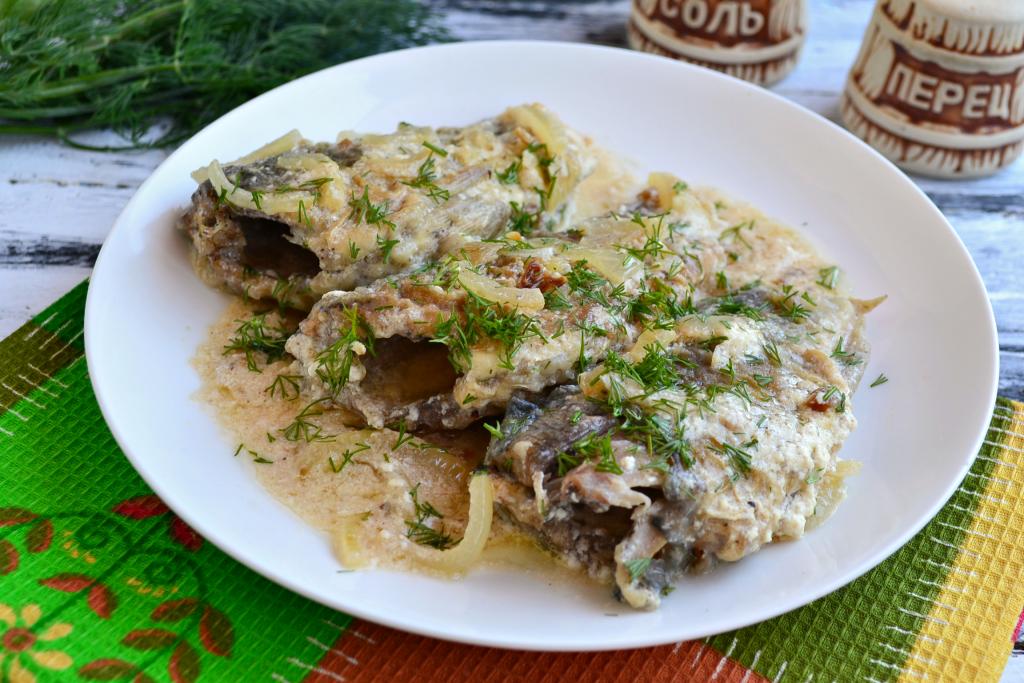 Необычайно нежных, сочных, ароматных и очень вкусных карасей, тушеных в сметане на сковороде, подать к столу.