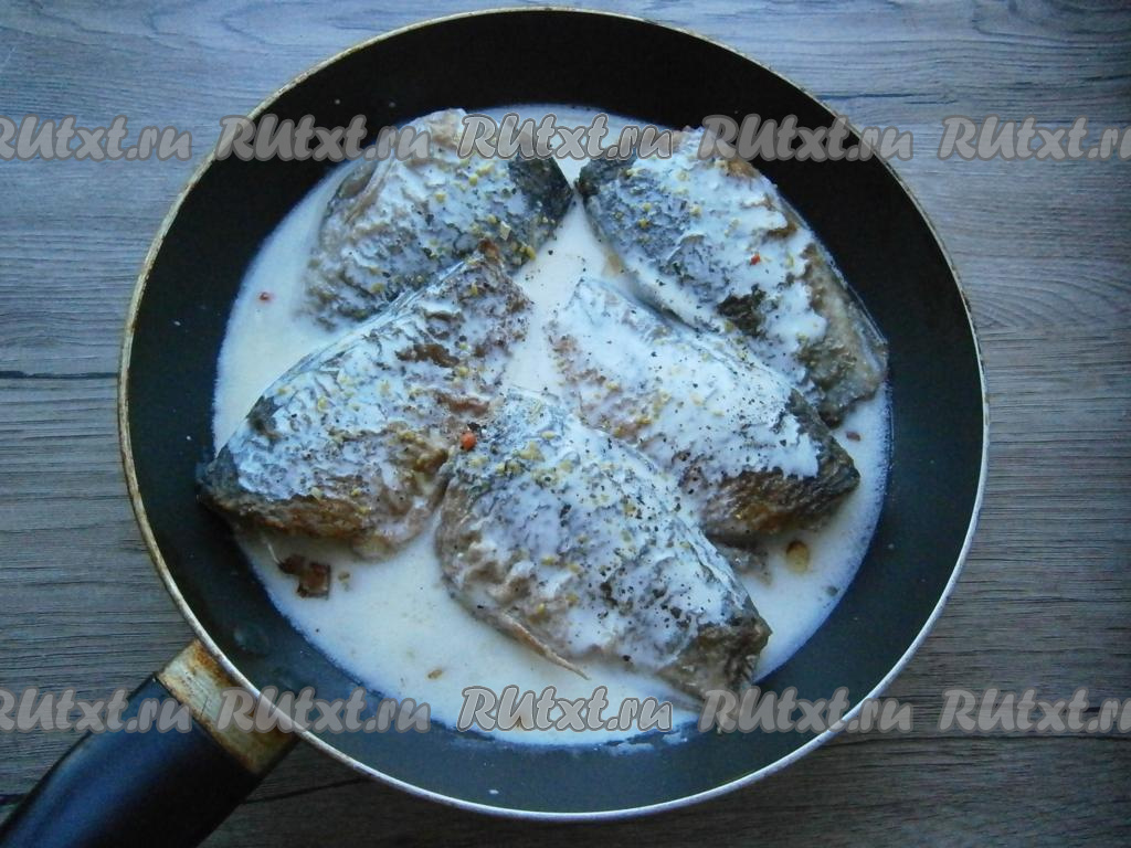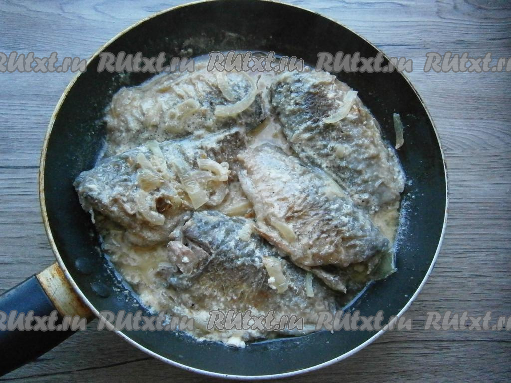 Довести до кипения, огонь убавить до минимального, прикрыть сковороду крышкой. Тушить карасей в сметане минут 15.