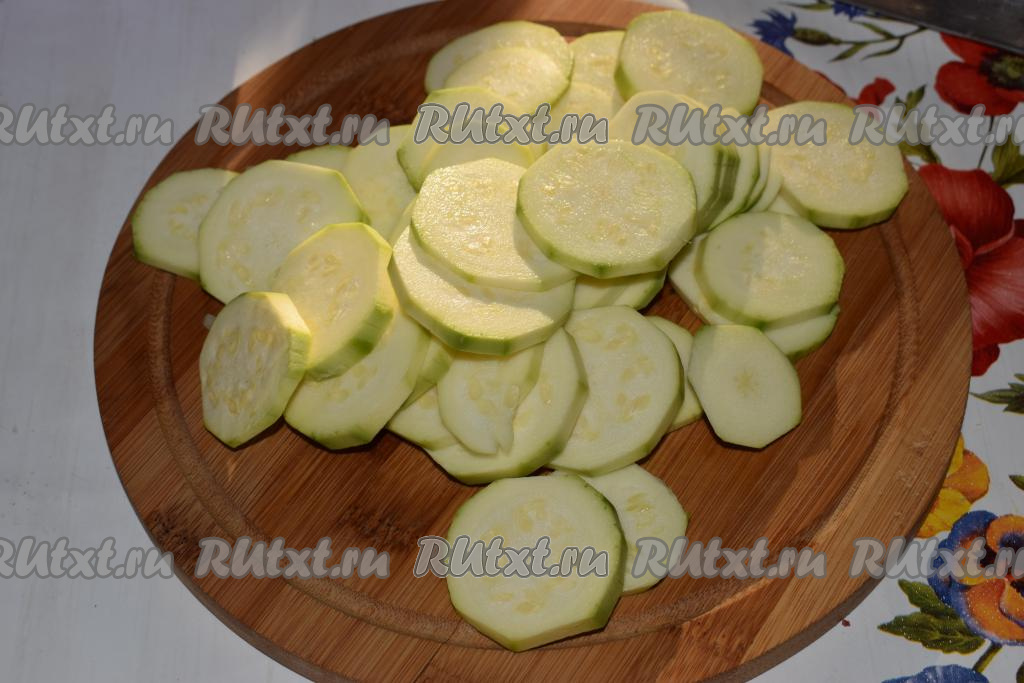 Кабачок очистим от кожицы и нарежем на кружочки толщиной около 0,5 см.