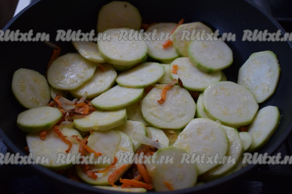 На среднем огне обжариваем лук с морковью до прозрачности, иногда помешивая, затем добавляем кабачок, солим его прямо в сковороде, так он пустит сок - а нам именно это и нужно для тушения овощей.
