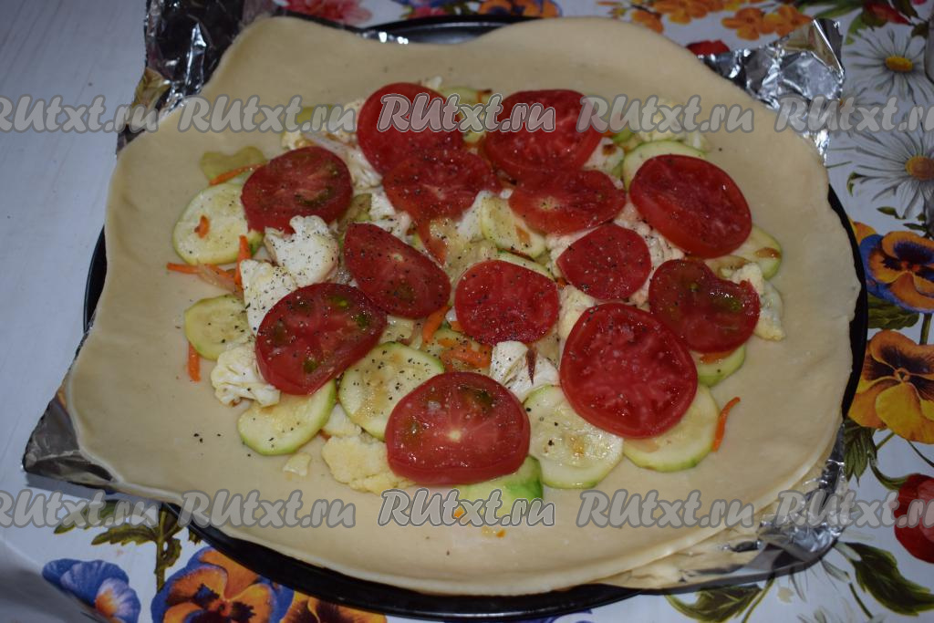 Перекладываем фольгу с тестом в форму и на середину галеты выкладываем нашу овощную начинку, оставляя края теста пустыми (как на фото).