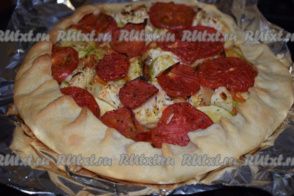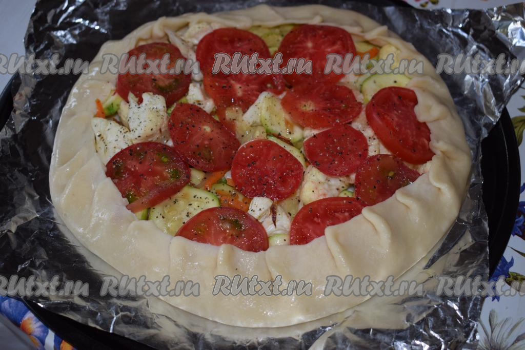 Тесто по краям смазываем растительным маслом и отправляем галету с овощами в разогретую до 180 градусов духовку на 40-45 минут.