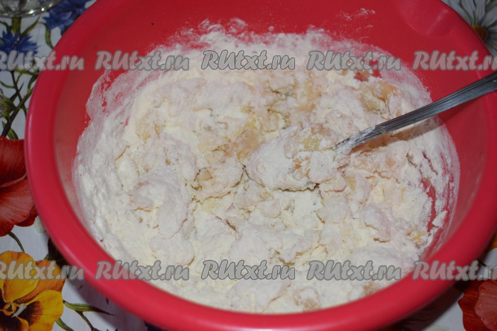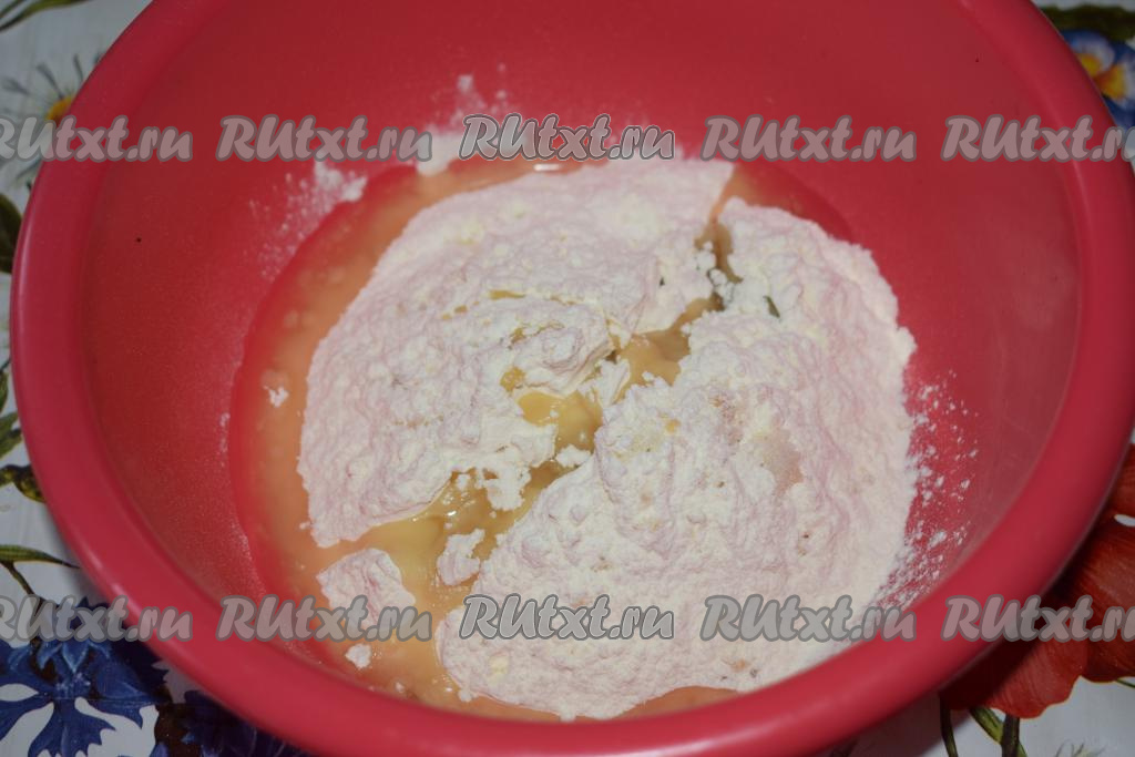 В миску выльем кипяток и аккуратно, с помощью вилки, начнем замешивать тесто.