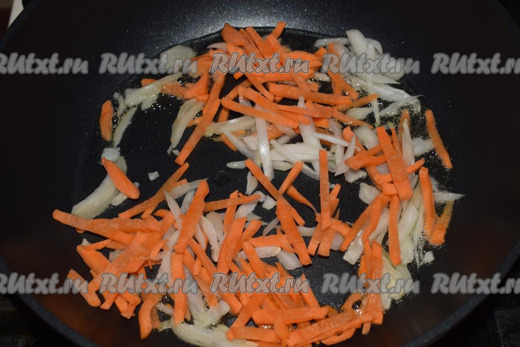 В сковороде разогреваем растительное масло, кладем лук и морковь.