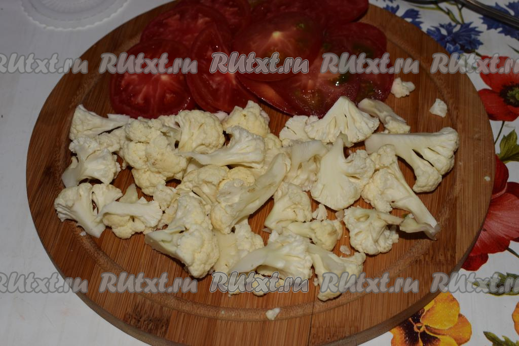 Цветную капусту разберем на соцветия, помидор нарежем на кружочки.