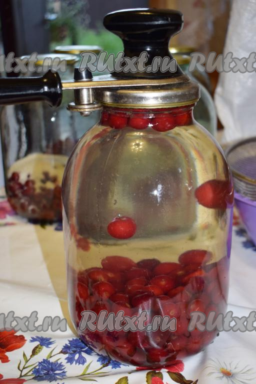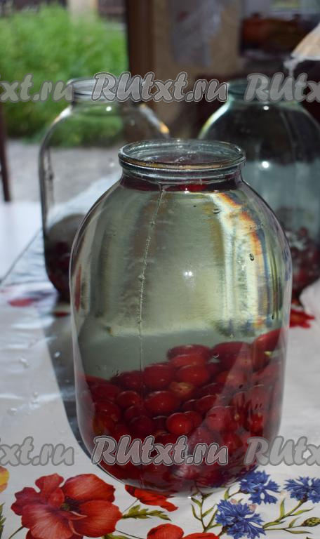 В подготовленные банки кладем вишню, она должна заполнять 1/3 банки.