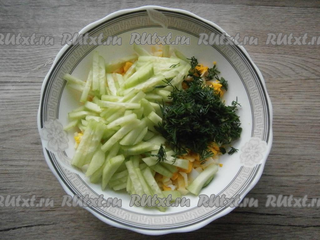 Огурец нарезать соломкой или брусочками и добавить к яйцам вместе с измельченным укропом.