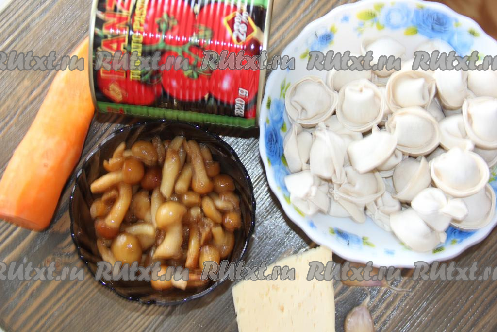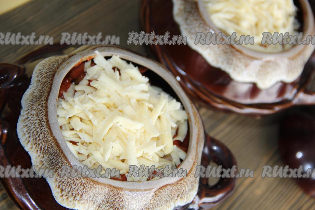 Залить пельмени тёплой водой или бульоном. Вода должна заполнить 1/2 горшочка. Сыр натереть на тёрке и выложить поверх зажарки. Накрыть горшочки крышками и поставить в разогретую духовку. Запекать пельмени с грибами 30 минут при температуре 220 градусов.