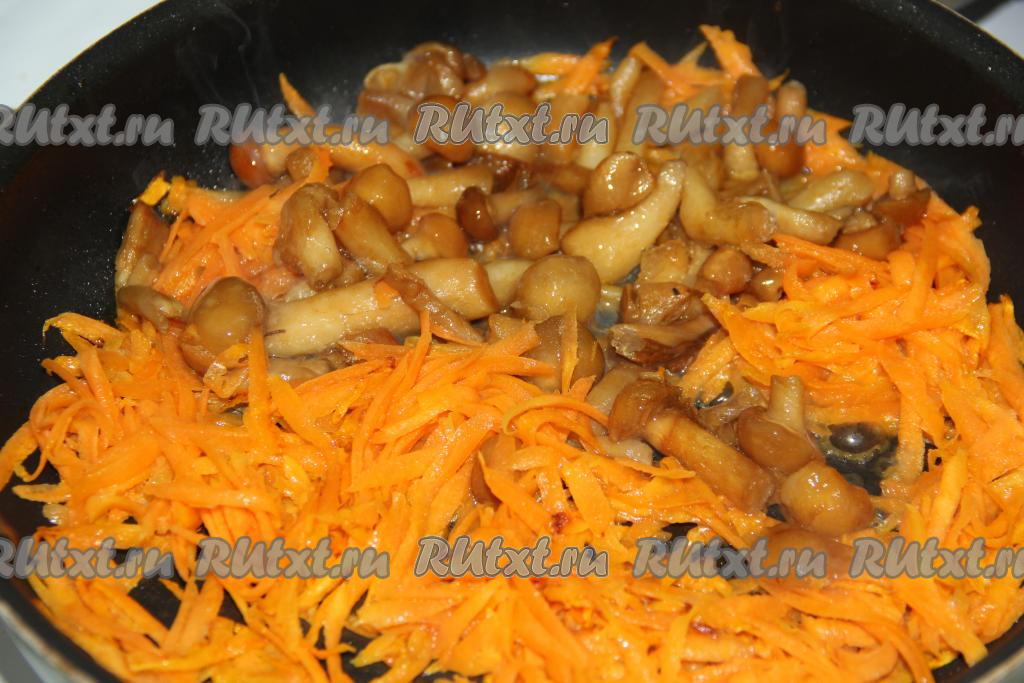 Затем на сковороду к обжаренной моркови выложить грибы (свежие или замороженные) и обжарить в течение 5 минут, периодически перемешивая. Если вы готовите со свежими лесными грибами, то их нужно предварительно перебрать, промыть и отварить в воде в течение минут 25 с момента закипания на небольшом огне, а уже потом добавлять на сковороду к обжаренной моркови.