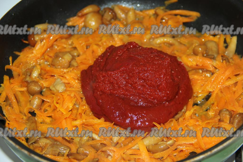 Затем к грибам, обжаренным с морковкой, добавить томатную пасту, тщательно перемешать и обжарить пару минут.