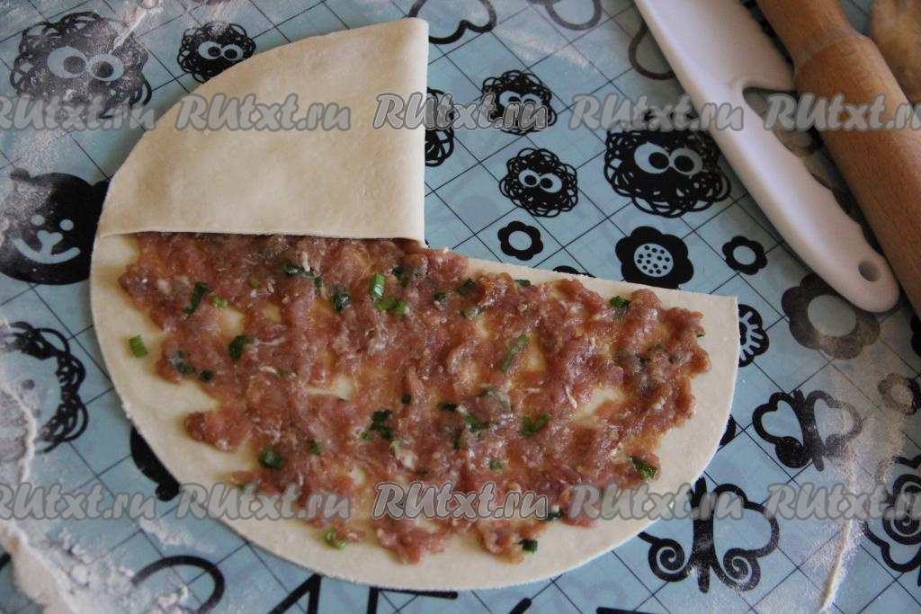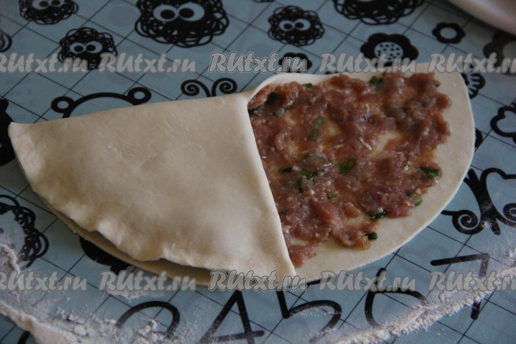 Сделать надрез на тесте до середины лепёшки и накрыть тестом начинку.