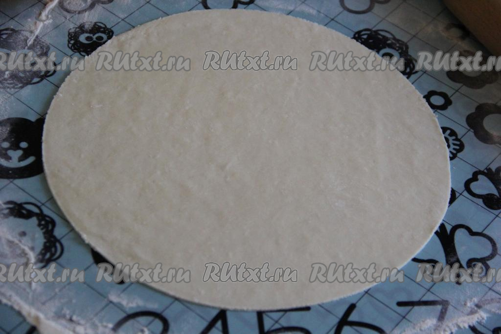 Тесто разделить на небольшие кусочки, а затем тонко раскатать на столе, присыпанном мукой. Я раскатала тесто, а затем обрезала края по тарелке диаметром 20 см.