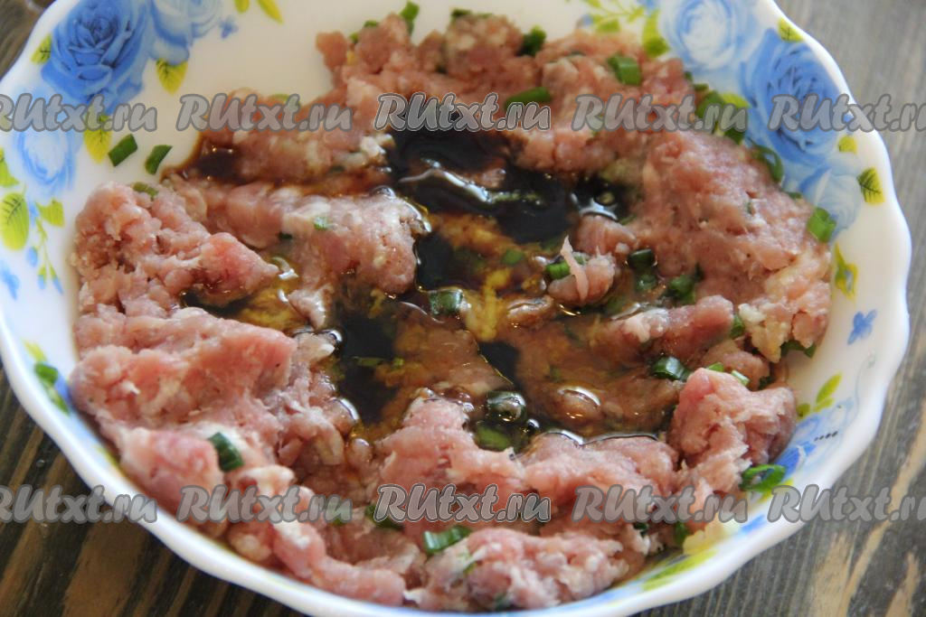 Хорошо перемешать фарш, затем влить соевый соус и 1 столовую ложку растительного масла. Тщательно перемешать фарш, он получится вязким и не густым.
