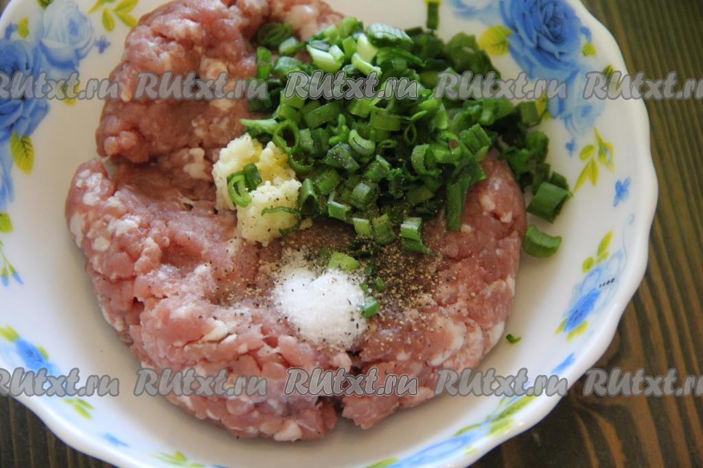 Пока тесто отдыхает, займёмся начинкой для китайских лепёшек. Чеснок очистить и пропустить через пресс. Зеленый лук вымыть, обсушить и мелко нарезать. Соединить мясной фарш, лук, чеснок, соль и перец.