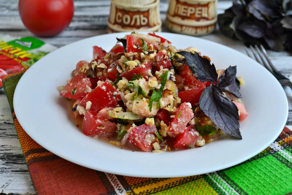 Предлагаю вам попробовать грузинский салат с помидорами и грецкими орехами, который получается очень вкусным, интересным, необычайно ароматным, чуть остреньким. Такой салатик отлично подать к жареному на углях или сковороде мясу. Обязательно приготовьте, салат очень вкусный!