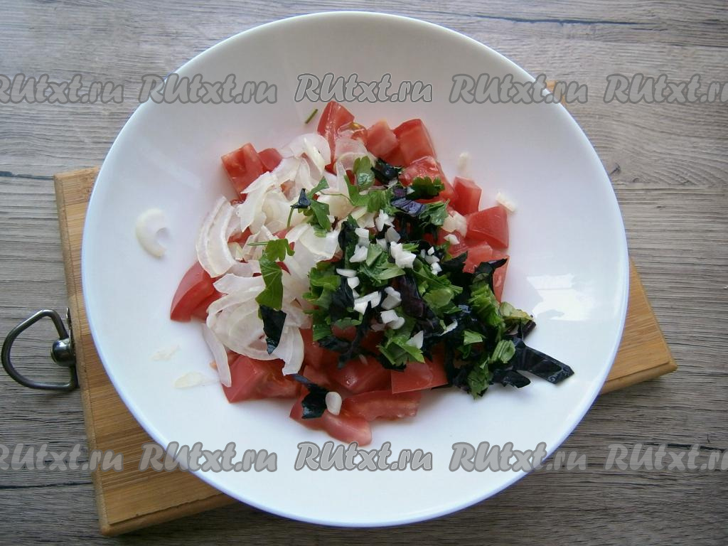 Лук и чеснок очистить. Спелые, но тугие помидоры нарезать средними кубиками, добавить нарезанный тонкими полукольцами или четвертинами репчатый лук.