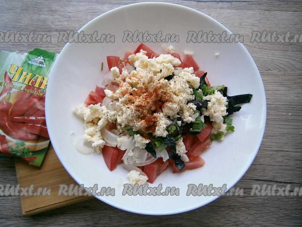 Сюда же добавить раскрошенный любой рассольный сыр и всыпать красный молотый чили.