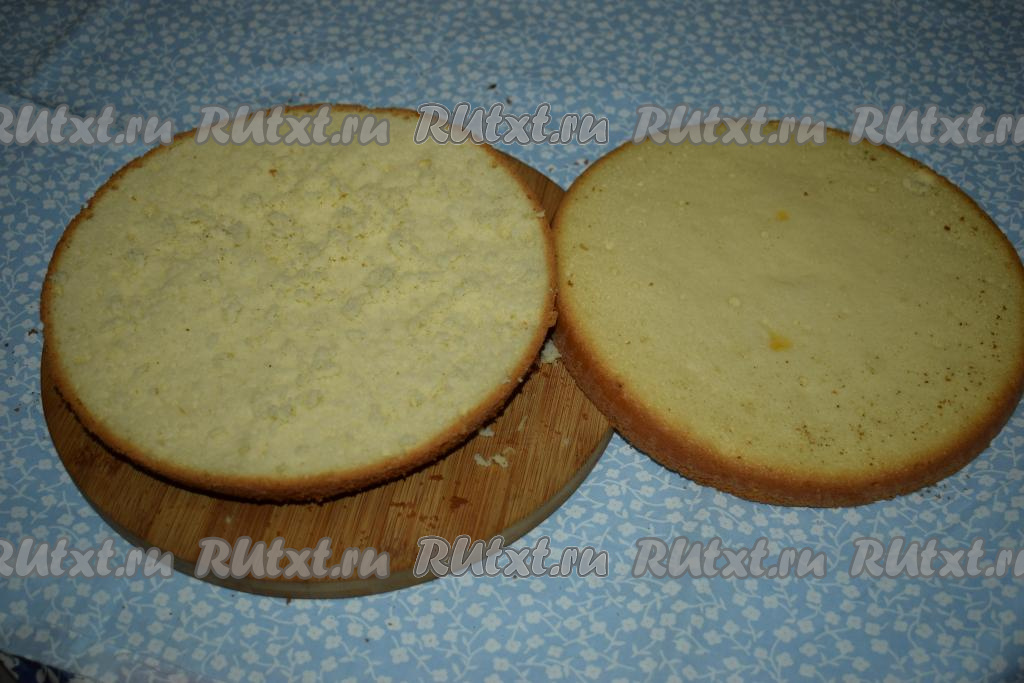 Охлаждаем наш бисквит не менее 2-3 часов, а лучше оставит его на ночь, а на утро разрезать на коржи.