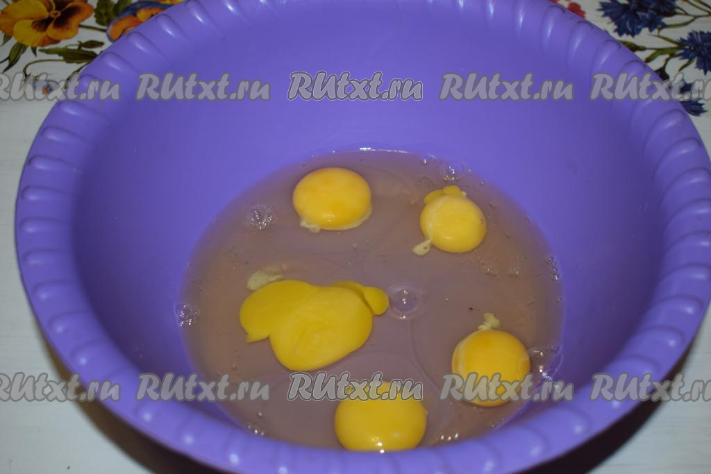 Для приготовления бисквита нужно просеять муку. Яйца достать заранее из холодильника и согреть до комнатной температуры. В глубокую миску разбить яйца, не разделяя на желтки и белки.