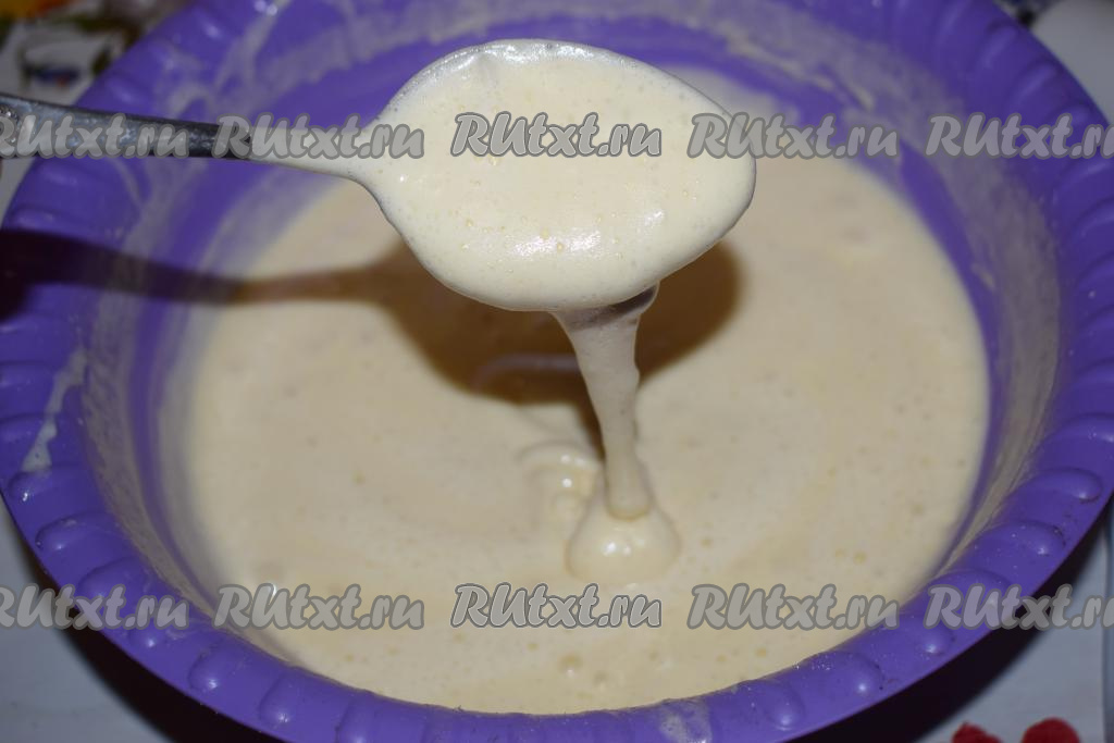 Когда вся мука добавлена, вымешиваем массу до однородности круговыми движениями ложки, как бы поднимая массу снизу вверх. Готовое тесто для бисквита получается лёгким, воздушным и по консистенции напоминает сметану (как на фото).