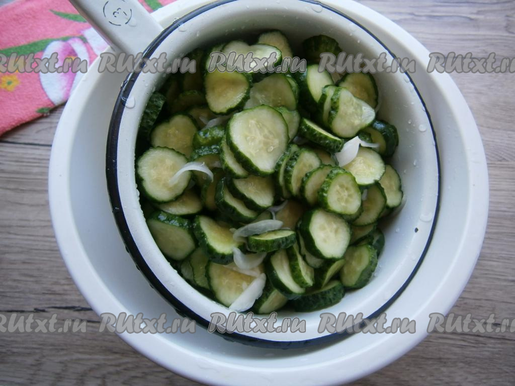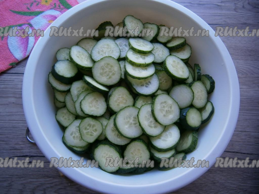 Нарезать огурцы кружочками, толщина которых должна быть не более 0,5 см.