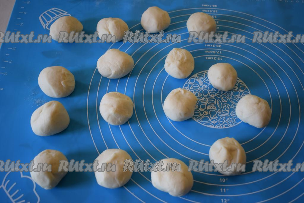 Отлежавшееся тесто слегка вымешиваем и делим на 16 равных частей.