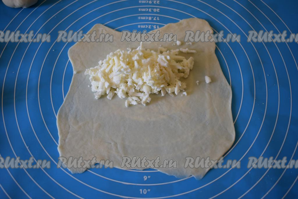 Присыпаем мукой поверхность, на которой будем работать с тестом. Каждую часть теста раскатываем в тонкий круг диаметром 17-18 см, сильно выравнивать края необязательно (сэкономим на этом время), так как мы все равно будем обрезать края по кругу при помощи тарелки или катка для чебуреков. На половину круга выкладываем начинку. Начинки надо класть, примерно, по 2 чайные ложки, визуально это будет смотреться как будто начинки многовато, не переживайте, так как в процессе жарки сыр немного подплавляется.