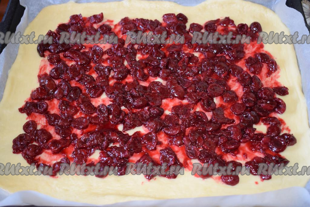 Перекладываем пергамент с тестом на противень, выкладываем вишневую начинку, равномерно распределяя ее по поверхности теста, оставляя края чистыми.